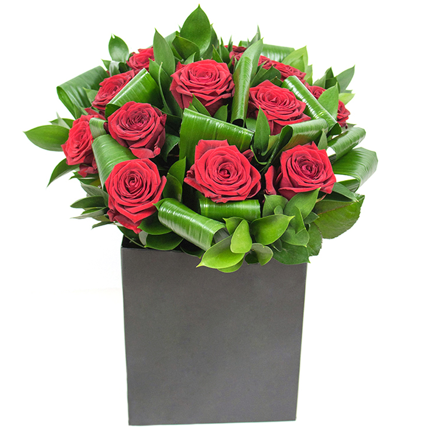 Enhance your home with our exquisite red rose display, featuring lush aspidistra leaves and graceful ruscus. This unique arrangement combines vibrant colors and elegant design to create a stunning floral centerpiece.